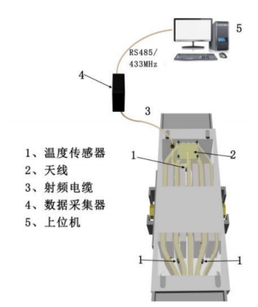 天線再通過射頻電纜將數據傳輸到數據采集器/溫度監控主機,再由數據采集器/溫度監控主機對數據進行處理并通過RS485或433MHz無線信號發往上位機。