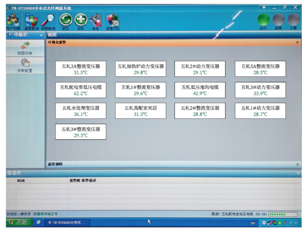 實時顯示溫度分部曲線和待測區域報警狀態,可根據實際工況分區設置多級報警閾值,并提供歷史數據查詢及統計分析功能。同時,可針對客戶具體應用,量身定制開發功能模塊,如可視化界面,電力載流量監測模塊,遠程中央監控模塊等。